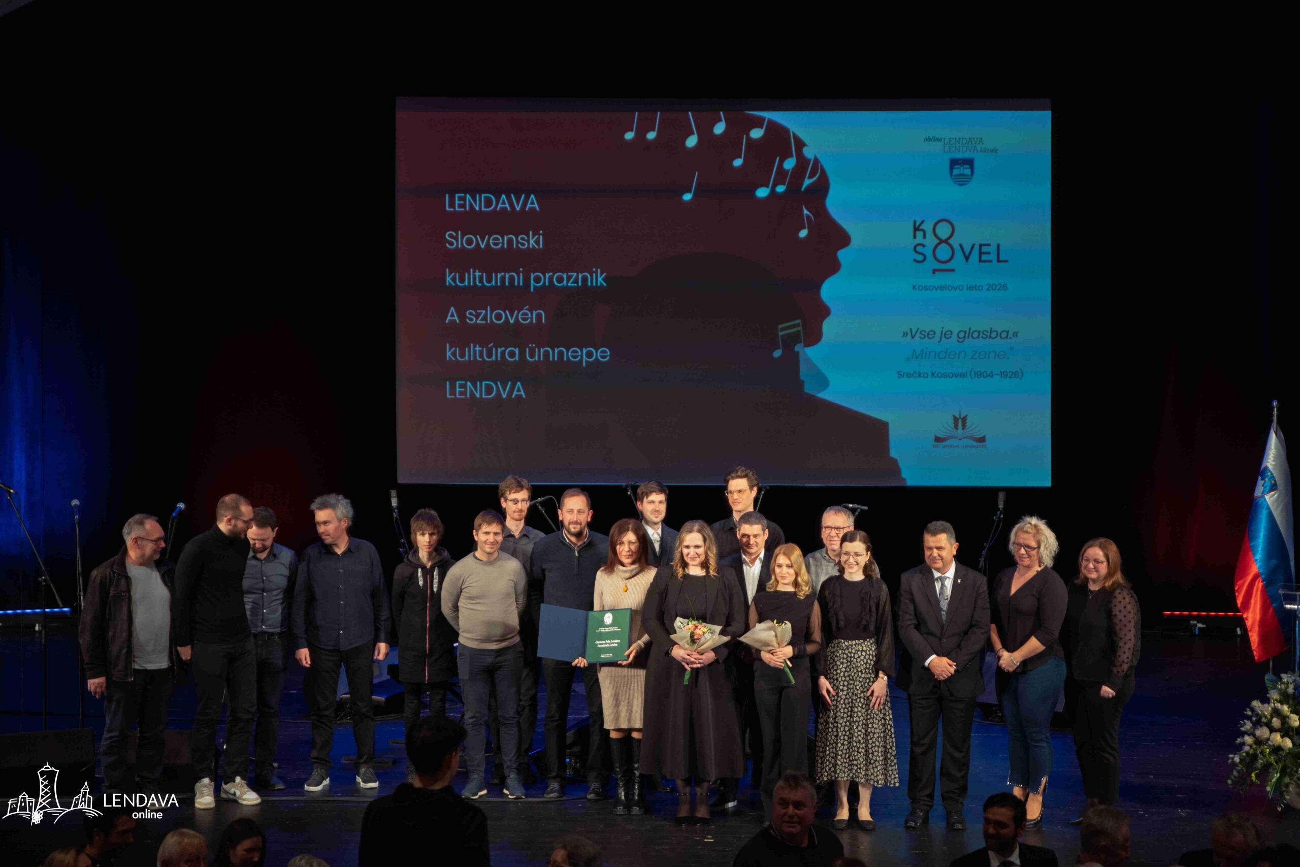 A lendvai Színház- és Hangversenyteremben múlt pénteken került sor a szlovén kulturális ünnep alkalmából rendezett központi önkormányzati ünnepségre. Az eseményen Lendva Község elismeréseket adott át a kultúra területén elért kiemelkedő eredményekért, amelyeket idén a Lendvai Zeneiskola, Franc Pal, Ferenc Király és Ferenc Hajós vehettek át. Az ünnepi beszédet a tavalyi díjazott, Kornelija Baša mondta el, a kulturális műsort pedig a Vita Lendva Vegyeskar, az Evterpe Énekegyüttes, a Duh Kvartett, valamint a Lendvai Zeneiskola tanulói tették színesebbé.